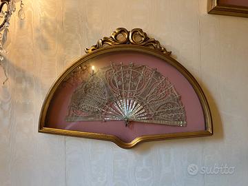 Collezione di otto antichi ventagli con strutture in legno, osso forato e bambù, impreziositi da ricami, piume e dettagli in oro. Tutti conservati all'interno di teche sagomate e dorate.