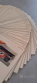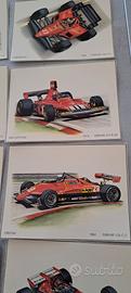 Celebre collezione di stampe intitolata "Quarant'anni di storia della Ferrari in Formula 1 (1948-1987)", illustrata dall'artista Paolo D'Alessio. Collezione completa n. 40 stampe. Questa serie è stata prodotta in collaborazione con Momo Design e comprende quaranta litografie su cartoncino che ripercorrono l'evoluzione delle monoposto della Scuderia Ferrari. Tra i modelli visibili nella foto si distinguono: Ferrari 312 T5 guidata da Gilles Villeneuve (1980). Ferrari 126 C di Didier Pironi (1981). Ferrari 312 B3 di Clay Regazzoni (1974). Queste stampe sono molto ricercate dai collezionisti di cimeli automobilistici. No confezione.