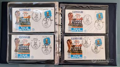 vendo serie di 52 buste relative alle partite del mondiale Spagnolo , 8 buste italiane che commemorano la vittoria al mondiale , 2 bustoni con i foglietti annullati , due foglietti nuovi , due prove dei foglietti in bianco e nero , i francobolli spagnoli che commemorano l'evento e il catalogo filatelico.