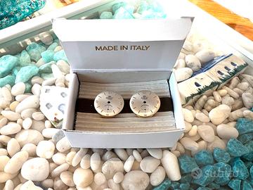 Copribottoni realizzati con recupero di quadranti originali di orologini svizzeri d'epoca metà ‘900, sottoposti a ripulitura e adattamento.