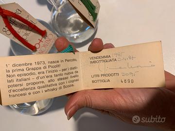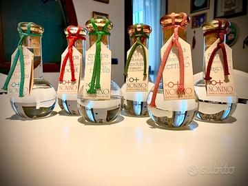 Collezione completa grappe di Monovitigno Nonino, con relativo elenco in dettaglio e cartellini con descrizione, numero di serie e litri prodotti. Il tutto in vetro di Murano.