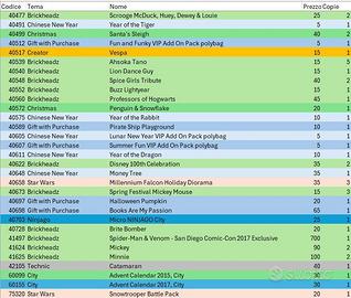 NELLE FOTO IN ANNUNCIO TROVATE L'ELENCO DETTAGLIATO DEI SET COI RELATIVI PREZZI, mentre qui sotto l'elenco dei codici suddiviso per tematica. Di alcuni set ho più copie. Se ci sono eventuali set presenti in foto e non in elenco, è perché sono già venduti (non posso rifare le foto ogni volta che vendo un articolo :-) )