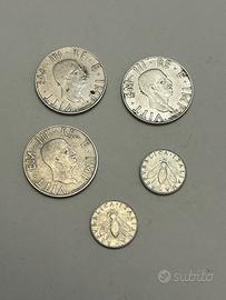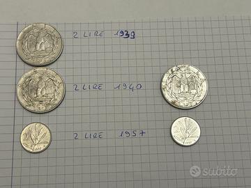 Collezione lotto 5 monete da 2 Lire Italia 1939, 1940, 1957 numismatica Dettagli in foto