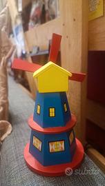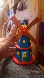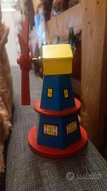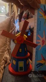 Grazioso mulino in legno, perfetto come elemento decorativo. Presenta colori vivaci e dettagli curati, acquistato in Olanda. - Base rossa. - Corpo blu con finestre gialle e porta verde. - Pale rosse con decorazioni verdi. - Scritta Holland sulla base.