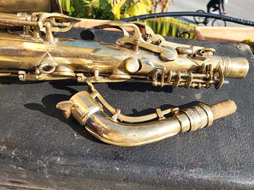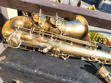 VENDO UN MIO SAX CONTRALTO PERSONALE: CG CONN 6M LADY FACE! MATRICOLA 270915, DEL 1935!! Uno degli anni assolutamente migliori della produzione di sassofoni Conn. STRUMENTO MOLTO RARO, ROLLED TONE HOLES (FORI DEI CAMINI RIGIRATI) E MICROTUNER AL CHIVER, SLACCATO ORIGINALE, NON RILACCATO! IL SAX SUONA MA I CUSCINETTI SONO USATI E NON SI ESCLUDE LA NECESSITA' DI AGGIUSTAMENTI, GRANDE SONORITA' E PROIEZIONE SONORA, TIMBRO POTENTE, COME HANNO SOLO I SAX CONN VINTAGE. MODELLO PROFESSIONALE E ESTREMAMENTE RARO DA TROVARSI. VENDUTO CON LA SUA CUSTODIA VINTAGE ORIGINALE DELL'EPOCA, COME DA FOTO. GRAZIE