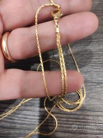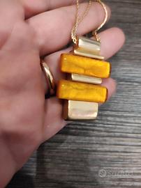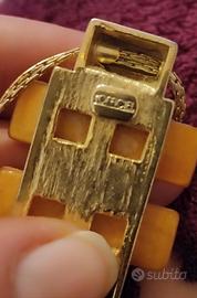 Anni 80, collana di prestigio a doppio filo, firmata L'Officiel, marchio di prestigio dell'epoca. Metallo placcato oro e pendente con ambra.