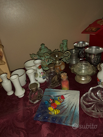 Soprammobili in miniature con vari vasetti ,elefanti in legno da piccolo a più grande ,portagioie e altro in cristallo e ceramica oltre legno prezzo trattabile