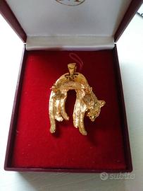 Spilla / Ciondolo con felino. Metallo dorato . Vintage , originale Postalmarket con confezione e certificato originale . 5 strass e un rubino. Disponibile ad offerte.