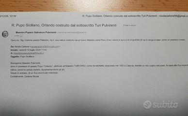 Vendo Pupo Siciliano da collezione, acquistato a Catania nel 1983. Il Pupo raffigura ORLANDO ed è attribuito a un importante Puparo del territorio, TURI FARO, confermato dal Certificato di Origine. Allego copia dell' Email, con relativa risposta, che ho inviato al Maestro Puparo Salvatore PULVIRENTI, dove mi ha suggerito una quotazione.