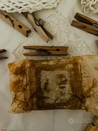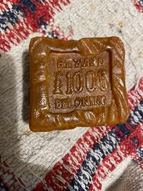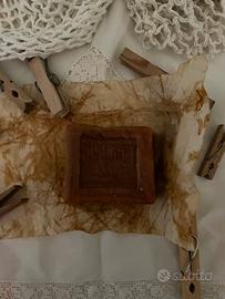 Antica saponetta inglese Sunlight Soap prodotta dalla famosa azienda Lever Brothers di Port Sunlight (Liverpool) tra la fine dell’Ottocento e i primi anni del Novecento. Il sapone presenta il marchio storico SUNLIGHT con sole nascente e la scritta “Reward £1000 Belonging”, tipica delle prime campagne pubblicitarie della Lever Brothers contro le imitazioni del celebre sapone Sunlight. All’epoca l’azienda offriva una ricompensa di 1000 sterline per contrastare le contraffazioni del marchio. Il Sunlight Soap nacque nel 1884 ed è considerato uno dei primi prodotti industriali venduti con marchio e pubblicità moderna. Questo esemplare pesa circa 120 grammi ed è accompagnato dalla carta cerata originale, oggi naturalmente impregnata dal sapone dopo oltre un secolo. Oggetto che racconta anche la storia della vita domestica di un tempo. A Trieste tra fine Ottocento e primi Novecento le cucine delle case erano molto grandi e dotate di lavandini in pietra utilizzati anche per lavare la biancheria. I saponi venivano spesso ridotti in scaglie e sciolti in acqua calda riscaldata sullo spargher insieme agli indumenti. Un piccolo testimone della storia del sapone e delle abitudini domestiche di oltre cento anni fa. Nota: È in vendita esclusivamente la saponetta Sunlight. Gli altri oggetti presenti nelle fotografie sono utilizzati solo come elementi scenografici per ricreare l’atmosfera del bucato di un tempo e non sono inclusi nella vendita. Dati tecnici Marca: Sunlight Soap Produttore: Lever Brothers – Port Sunlight, Liverpool Periodo: circa 1895 – 1910 Peso: circa 120 g Materiale: sapone a base di oli Confezione: carta cerata originale presente Condizioni: conservato con segni del tempo naturali.