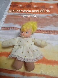 Piccola bambola vintage degli anni '60, alta circa 12 cm. Indossa un vestitino bianco con piccoli fiori gialli e pizzo.