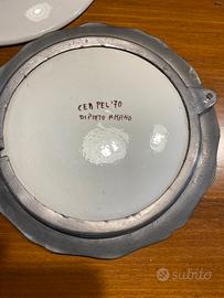 Vendo n 2 piatti in ceramica dipinti a mano con struttura in peltro molto vecchi . Prezzo 40 euro