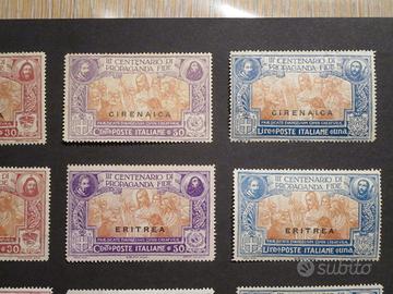 Serie complete del 1923 della Propaganda Fide della Cirenaica Sassone S. 1, Eritrea S.12, Somalia S. 10 e Tripolitania S.1.