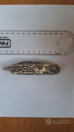 Coltello bianco/grigio: lati scolpiti e levigati con rilievo di un cervo e foglie di quercia, tipico dei coltelli da caccia tedeschi o austriaci anni ’60-’80. Forse in plastica effetto corno. Multiuso e multifunzione.
