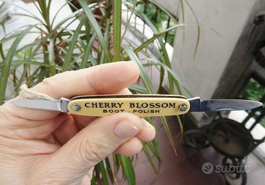 Questo coltellino bilama inglese, ormai divenuto introvabile, fu un gradito souvenir che il mio parente ricevette quando acquistò un bel paio di scarpe da uomo in un negozio dello Yorkshire, in Gran Bretagna. Erano tempi lontanissimi dove ogni piccolo oggetto aveva un suo pregio. Esso reca sulla guancetta del fronte la marca di un lucido da scarpe molto noto all'epoca: il Cherry Blossom. Le due guancette molto robuste sembrano di osso ma sono in ottimo materiale sintetico. Visibili i due rivetti di fermo che nel retro sono diversi: uno è piatto, l'altro possiede un piccolo cilindro con anellino di tenuta per permettere alla cordicella di sicurezza di restare ben fissata. L'alloggiamento per le lame è in ottone e le lame sono tutte marchiate. Una cosa impensabile oggi per un coltellino di queste dimensioni, dove anche nei coltelli di diversa misura molto più costosi è spesso difficile trovare un solo