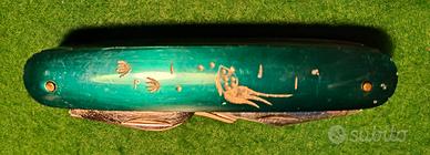 Design: Il manico è di un colore verde brillante con piccole decorazioni incise, tra cui l'immagine stilizzata di un pesce.