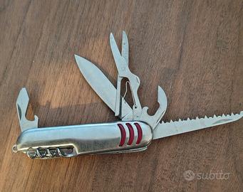 Coltellino multiuso cromato, 10 funzionalità diverse, attacco per portachiavi, vendo per inutilizzo, nessun segno di ruggine, solo qualche leggero graffio che si nota in controluce.