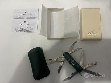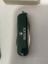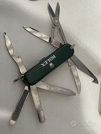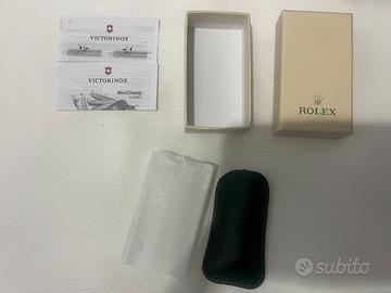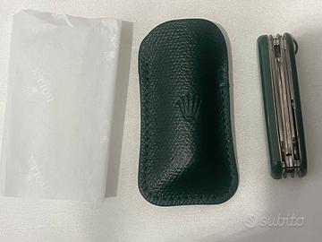 Piccolo Coltellino multiuso della Victorinox prodotto per Rolex con scatola Rolex ,carta bianca Rolex ,due fogli Victorinox con spiegazioni custodia in pelle verde marchiata Rolex .Omaggio dei concessionari sul acquisto di orologi di prestigio. Per collezionisti e appassionati del mondo Rolex