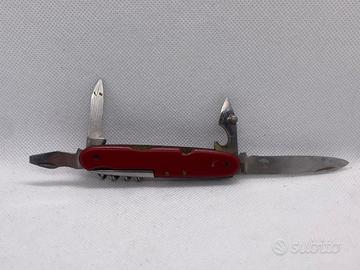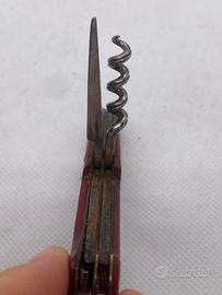 Raro coltellino multiuso d'epoca, risalente alla prima metà del Novecento, probabilmente di manifattura tedesca o francese. Si tratta di un pezzo da collezione autentico, caratterizzato da un particolare alesatore/punteruolo a sezione quadrata e un cavatappi con spirale a elica piatta, tipici della produzione dell'epoca. Il coltellino presenta guancette rosse originali con perni in ottone a vista e include una lama principale e un apriscatole/apribottiglie dal design arcaico. L'oggetto conserva la sua patina originale e le molle sono funzionali; un'ottima base per un restauro conservativo o per arricchire una collezione di coltelleria storica.