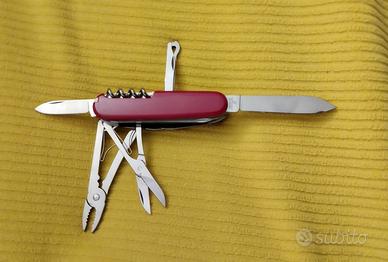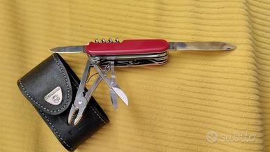 Coltellino svizzero, originale, inusato, forse 23 utensili (non li ho contati) con custodia in pelle nera per cintura. Scatola della confezione originale con segni di usura come da foto. Spedisco con Subito o ritiro a mano Lodi citta'