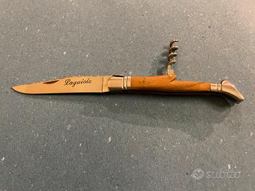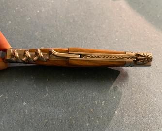 Vendo splendido coltello Laguiole originale, pezzo di alta qualità artigianale. Il manico è in legno pregiato con finiture in ottone e include il classico cavatappi a spirale.