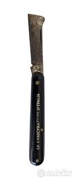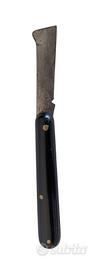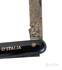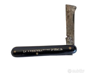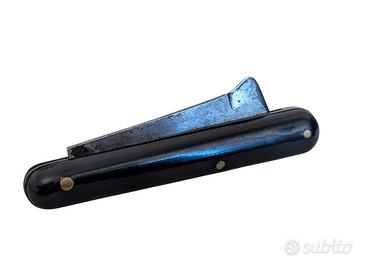 Coltello pieghevole da innesto marca Gallo Maniago anni 30-40 con manico in bachelite nera ed iscrizione pubblicitaria.