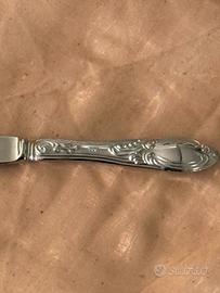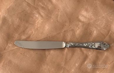 Coltello da dessert Vintage Arg 800 Questo coltello è un pezzo di posateria vintage in argento, coltello da tavola inargentocon un manico finemente decorato motivo ornamentale elaborato, spesso associato a stili come ilBaroccoo ilLuigi XV, caratterizzato da volute e dettagli floreali in stile classico-barocco. Argento, con marchi di purezza visibili come "800" senza marchi di fabbrica (non sempre presenti nella posateria Vintage) : all'analisi fotografica non sembra avere divisione (come solito) tra lama e manico quindi totalmente Argento 800: si tratta di una finitura molto resistente che non si sfalda facilmente nel tempo, a differenza delle placcature più economiche. Non ha filo lama come in origine. Dettagli come da foto.