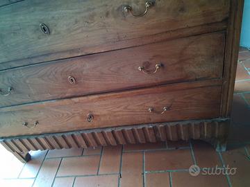 Il mobile nell'immagine è un comò antico, identificabile come uno stile classico italiano (probabilmenteCarlo Xo influenzato dalLuigi Filippo), risalente tipicamente alXIX secolo (1800) Materiale:Realizzato solitamente innoce massello, spesso con intarsi decorativi in legni più chiari come il bosso. Caratteristiche:Presenta quattro cassetti, con quello superiore talvolta più sottile o decorato con intarsi naturalistici. Le maniglie e le bocchette delle serrature sono in ottone. misure cm 125 x54 x h 108