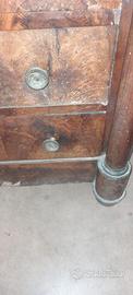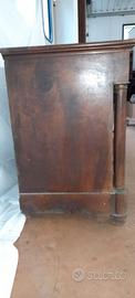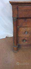 Como' impero dei primi 800 in noce massello e piuma di noce .Il fronte e' composto da tre cassetti della stessa altezza e da un cassettino sporgente sottopiano .Il tutto e' incorniciato ai lati da colonne di diametro circolare con decori in bronzo dorato .