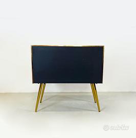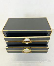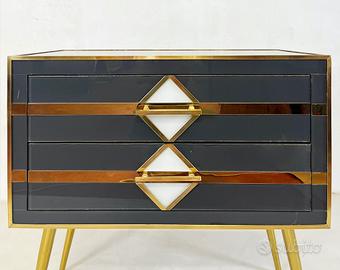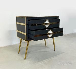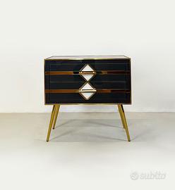 Particolare comodino Vintage 1970 interamente in vetro colorato grigio scuro con dettagli in ottone. Caratterizzato da due cassetti frontali con interni in ebano laccato nero.