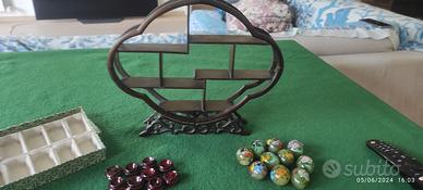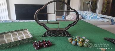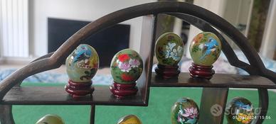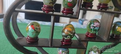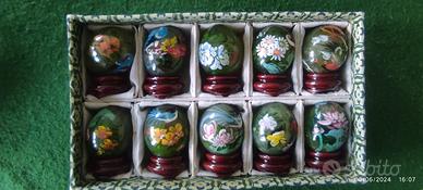 Causa dismissione collezione uova, unicamente per puro realizzo, a soli 50,00 euro (NON TRATTABILI) cedo rarissima e raffinata composizione artistica ORIGINALE orientale d'epoca rappresentata da n. 10 mini uova in pietra opalescente verde, ognuna dissimile, per soggetto, all'altra. Il tutto eseguito rigorosamente a mano. Le mini uova presentano bellissimi decori floreali ai quali, in ognuna di esse, si aggiungono differenti uccelli di ogni genere (colibrì, pappagallini etc.) pertanto ogni uovo ha i suoi fiori ed uccelli diversi l'uno dall'altro. Le uova, appoggiate su un proprio mini piedistallo in legno scuro, si collocano in un'artistica e carinissima struttura asimmetrica a ripiani, anch'essa in legno scuro, dai contorni armonicamente arrotondati (vedi foto annuncio).