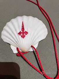 Conchiglia di Santiago decorata con la Croce di San Giacomo. - Decorazione rossa. - Cordino rosso per appenderla.
