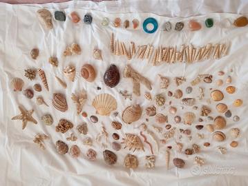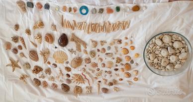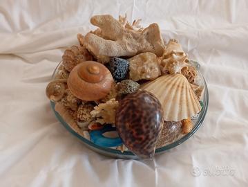 tantissime conchiglie e pietre con centrotavola in vetro. bellissimo.
