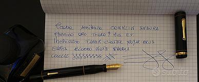 Fabbricante: Conklin (Made in USA) Modello: Endura. Anno di produzione: 1929 >>> ? Materiale e misura del pennino: Oro Titolo ? (Non è riportato sul pennino). Mis. EF. Sistema di caricamento: Levetta Materiale penna: Ebanite nera, Veretta e Clip placcate oro. Condizioni estetiche: Ottime. Piccolissimi segni del tempo, veretta cappuccio e clip con doratura parzialmente consumata. Condizioni meccaniche: Ottime, sacchetto inchiostro sostituito. Penna perfettamente funzionante. Scatola: No.