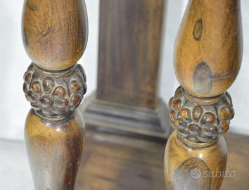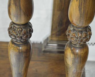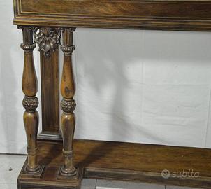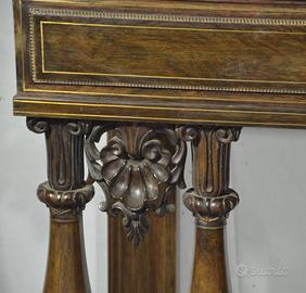 Raffinata console antica d’epoca realizzata in palissandro, impreziosita da eleganti intarsi in ottone e splendidi intagli floreali in stile classico. Il mobile presenta una struttura equilibrata e solida, sostenuta da colonne tornite finemente lavorate, che conferiscono un’eleganza scultorea senza tempo.