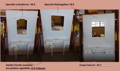 QUESTO MOBILE SI PUO' COMPORRE A PROPRIO PIACIMENTO PARTENDO DAL CORPO CONSOLLE, SI PUO' SCIEGLIERE LO SPECCHIO SE RETTANGOLARE O A GENDARME E SE METTERE O MENO LE GAMBE