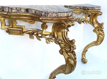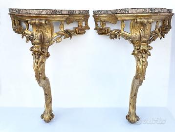 Consolle a staffa : caratterizzate da una sola gamba a voluta (convesso,concavo,convesso), con tema di fogliame e roccaie.