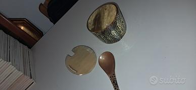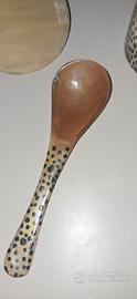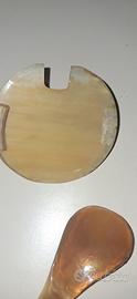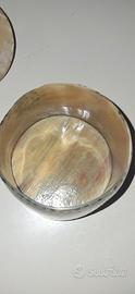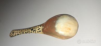 Contenitore con cucchiaio in corno di Bufalo, misure; altezza 11 cm, diametro 9,5 cm. Si tratta di un oggetto vintage risale anni 50/60, si può notare nella 4ª foto che manca un pezzettino di corno che serviva a mantenere Centrato il coperchio per il resto è in ottimo stato.,