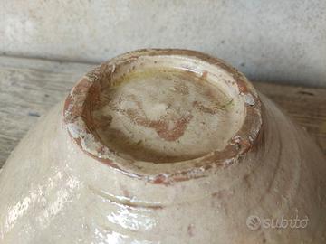 Contenitore in ceramica vintage, in uso in campagna o nei mercati conservare olive e altri prodotti. Interno decorato con sfumature di colore verde, bruno, blu e giallo senape. Originale e mai utilizzato. Visibili sul fonda i tre punti di appoggio per la cottura nel forno. Diametro cm 37, altrezza cm 14