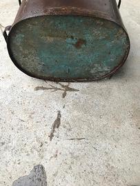 largo 40 cm circa , alto 46 cm circa , msnca una staffa laterale e coperchio. In fotografia lo vedete appena lavato , deve ancora asciugare. non ha buchi ma è arrugginito.