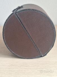 Elegante contenitore in simil pelle marrone, che ricopre cilindro in cartone rigido, e 2 maniglie da trasporto.