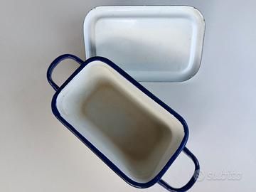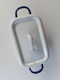 Contenitore vintage Smalterie Italiane in metallo smaltato bianco e blu Contenitore rettangolare vintage in metallo smaltato bianco con bordi e manici blu cobalto, prodotto dalle storiche Smalterie Italiane (marchio presente sul fondo). Il logo suggerisce una datazione risalente alla prima metà del '900 (anni '30 - '50), periodo d’oro della produzione di smalti industriali in Italia. Possibili utilizzi: Arredo cucina: Perfetta come porta-spezie, contenitore per bustine di tè o come biscottiera dal sapore rétro. Bagno: Ideale per riporre saponette artigianali, sali da bagno o piccoli asciugamani arrotolati in stile Shabby Chic. Giardinaggio: Molto decorativa come piccola fioriera per piante grasse o erbe aromatiche. Collezionismo: Un pezzo di storia del design industriale italiano da esporre su una credenza. Dimensioni (compresi i manici): 22 x 10 x 8,5 cm Condizioni: L'oggetto è vissuto e presenta i segni del tempo che ne attestano l'autenticità. Come visibile in foto, mancano piccoli frammenti di smalto in due punti sul bordo e sul coperchio. All'interno sono presenti depositi di calcare dovuti all'uso prolungato.