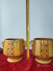 In ceramica con coperchi, di inizio secolo con disegni geometrici . I contenitori , eseguiti interamente a mano hanno diametri e forme ( uno 10 cm e l'altro 11 cm ) diversi , come da foto . L'altezza è unica ( 12 cm) . Sono presenti manici a forma di teste di animali. Si precisa che un contenitore ha due sbeccature ( una grande e una piccola, mente il secondo contenitore ha una felatura sul coperchio , come da foto. Su richiesta si possono fornire altre fotografie .