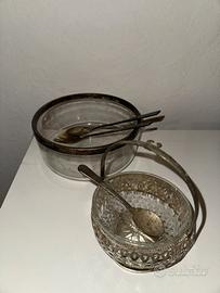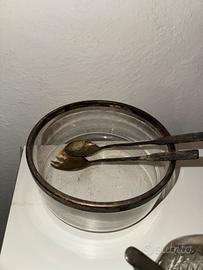 Oggettistica di antiquariato, contenitori in vetro e inox placcato d’argento, con set forchetta e cucchiaio MK Zn4 Vintage placcato Argento per Insalata/Servizio. Rinvenuti nella casa che compriamo, segnati dal tempo ma mai usati (da noi almeno).