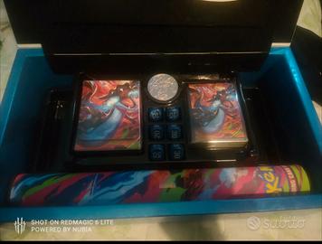 Vendo contenuto Fiamme Spettrali dadi, moneta, deck box e carte promo ancora Sealed e playmat compreso di scatola