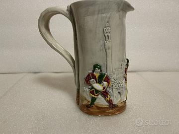 Boccale in ceramica policroma delle ceramiche Bonci di Siena raffigurante due Alfieri, uno che sbandiera e uno con il tamburello, della Contrada del Drago