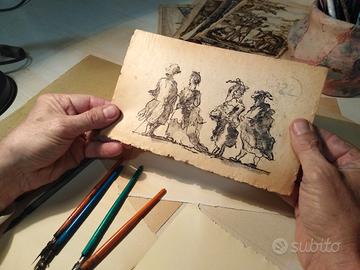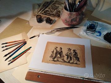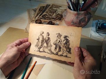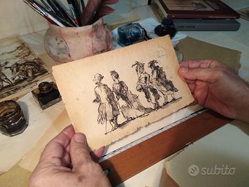 Questa è una fedele riproduzione a mano di un celebre disegno di Francesco Guardi, datato 1785 e conservato al Museo Correr di Venezia, che rappresenta due coppie in maschera in un'atmosfera carnevalesca tipica del Settecento veneziano. Realizzata con china e pennino su carta antica di oltre cinquant'anni, presenta una naturale brunitura del tempo e bordi delicatamente sfrangiati, conferendo un aspetto autenticamente vintage. Ideale per collezionisti di arte veneta ed originale idea regalo.