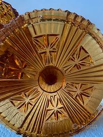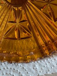 Centrotavola vintage in vetro pressato ambra, anni ’60–’70, Ø 15,5 cm, h 10 cm, peso 1,240 kg. Decorazioni luminose a stella, bordo sagomato.