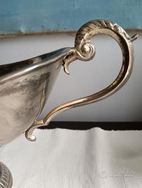 Una grande, elegante coppa da centrotavola, utilizzabile anche come fruttiera, in metallo argentato, molto ben conservata e lucidabile a piacere con normale prodotto per l’argento. Misure:49 x 22 x H.22 cm Non presenta marchi o punzoni. Un oggetto di grande eleganza, ideale anche per un regalo. Normali segni di utilizzo alla patina.