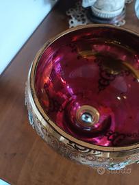 Elegante centrotavola/coppa in vetro rubino soffiato con ricca decorazione in oro zecchino e smalti policromi a rilievo raffiguranti motivi floreali.